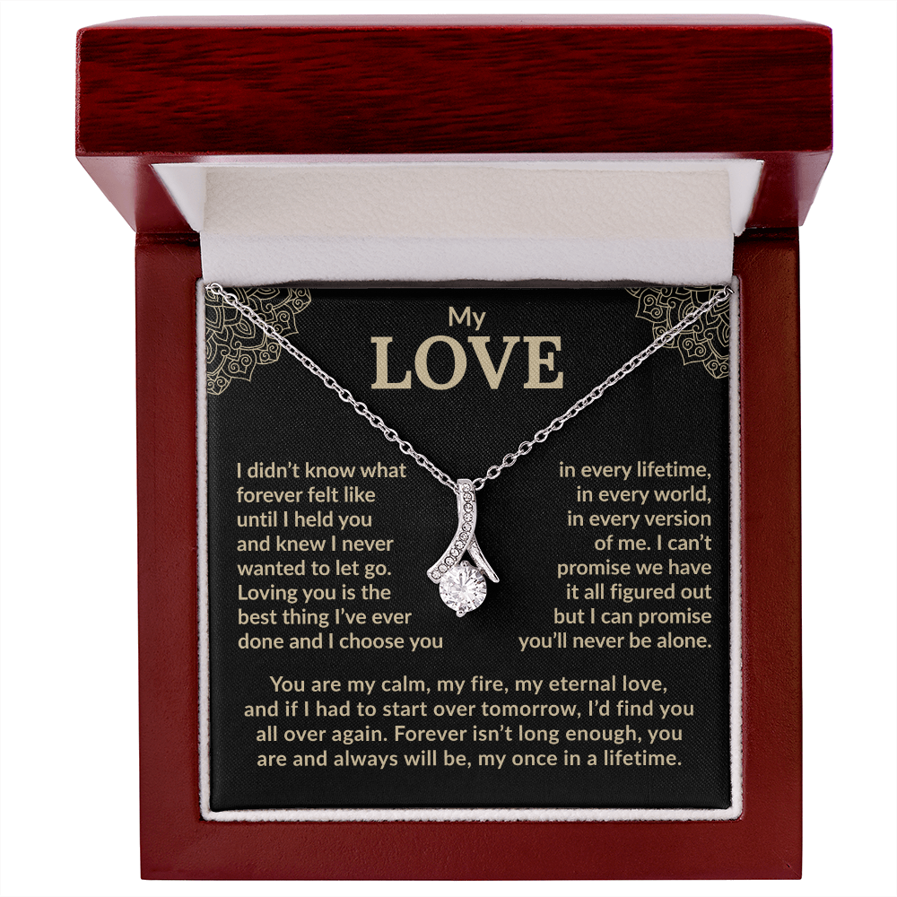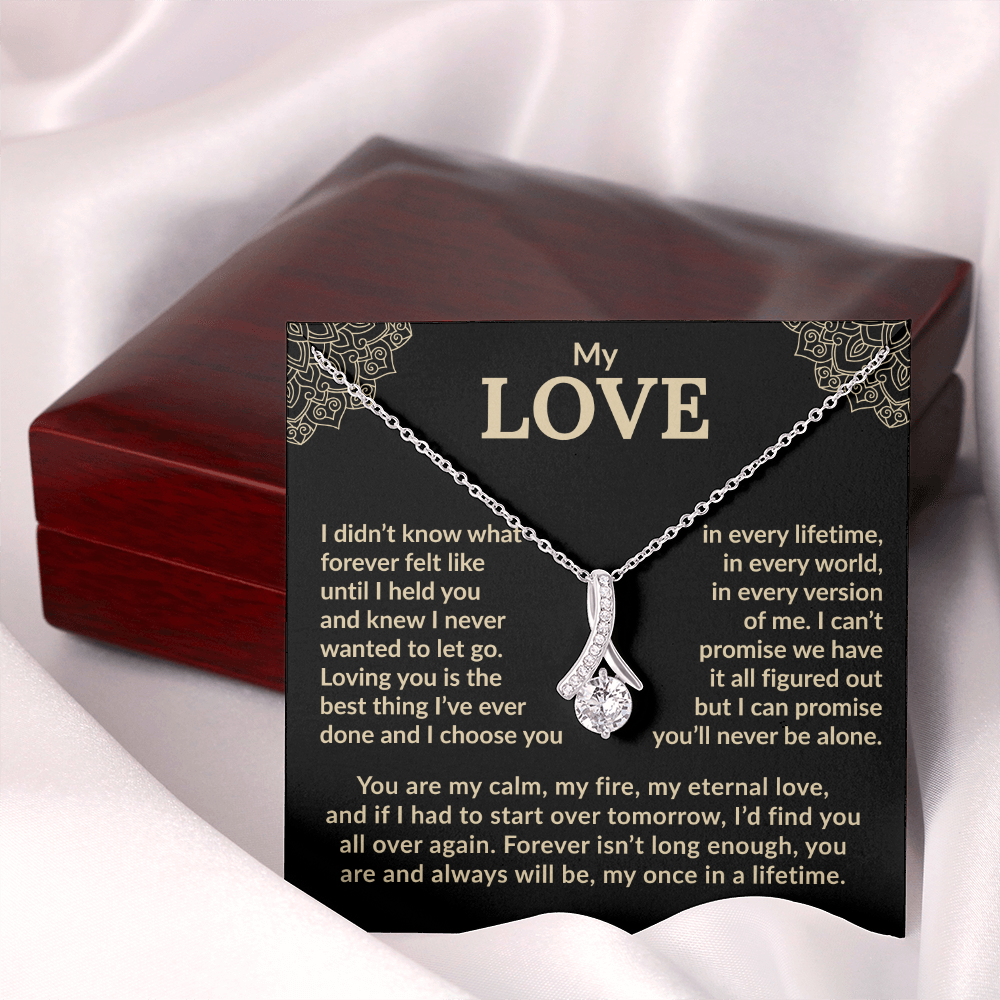 Your piece is lovingly packaged in a premium mahogany-style luxury box featuring a brilliant LED spotlight for an elegant gift presentation. Celebrate everlasting love with our Love Knot Necklace, featuring sparkling cubic zirconia and a heartfelt message card. Designed in the Carolinas, and ships fast from our Florida production facility, nationwide.