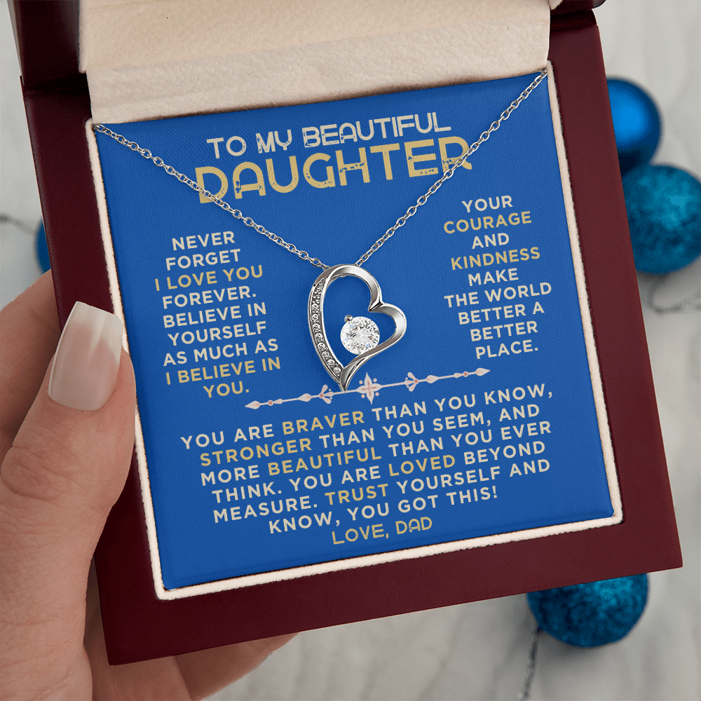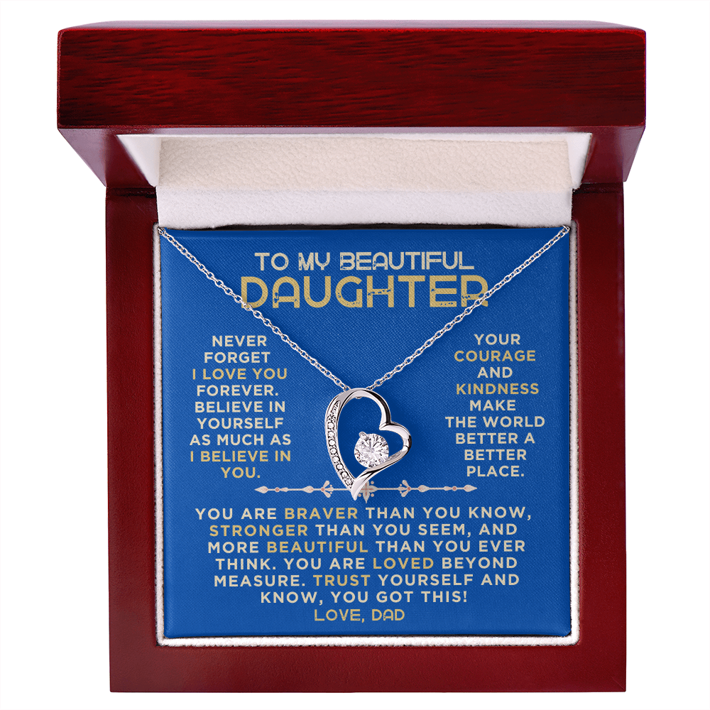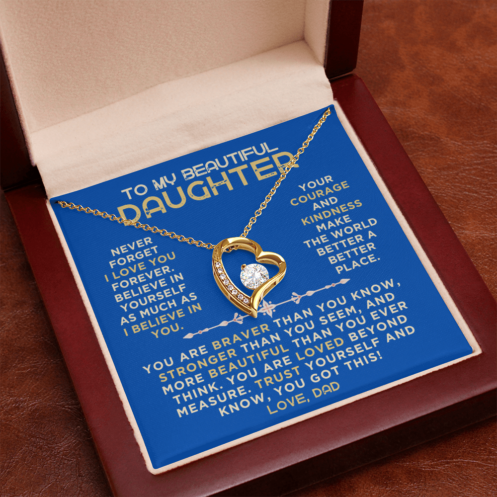 Your Daughter is your world. This lets her know just how much you love her and are cheering her on in life. Be proud of the woman she has become. This dazzling Forever Love Necklace is sure to make your daughter's heart melt! She will not expect this. You will gift her a necklace featuring a stunning 6.5mm CZ crystal surrounded by a polished heart pendant embellished with smaller crystals to add extra sparkle and shine. Beautifully crafted with either a white gold or yellow gold finish, be sure to give her a classic gift she can enjoy and wear every day.