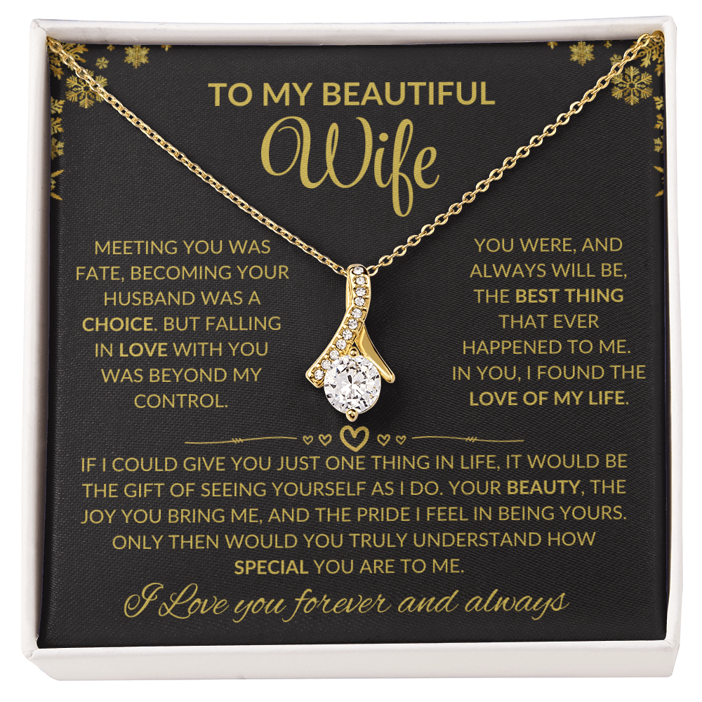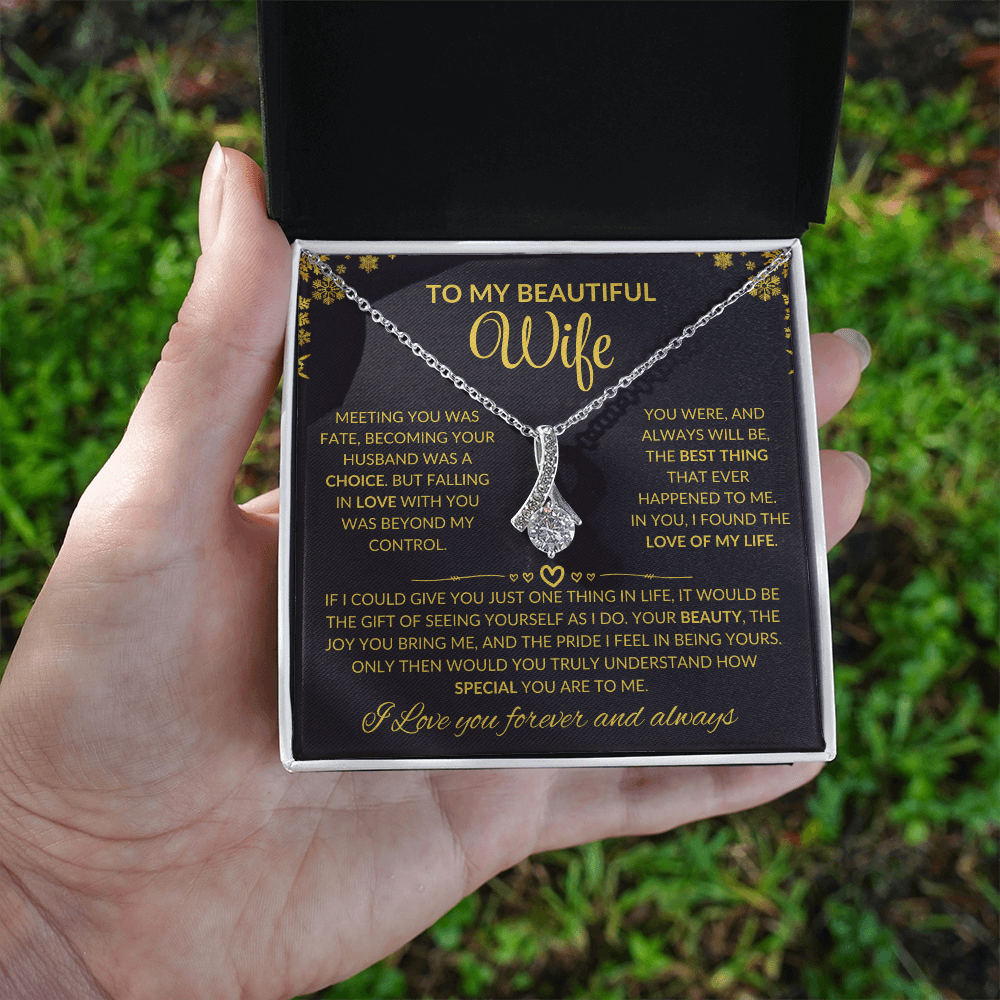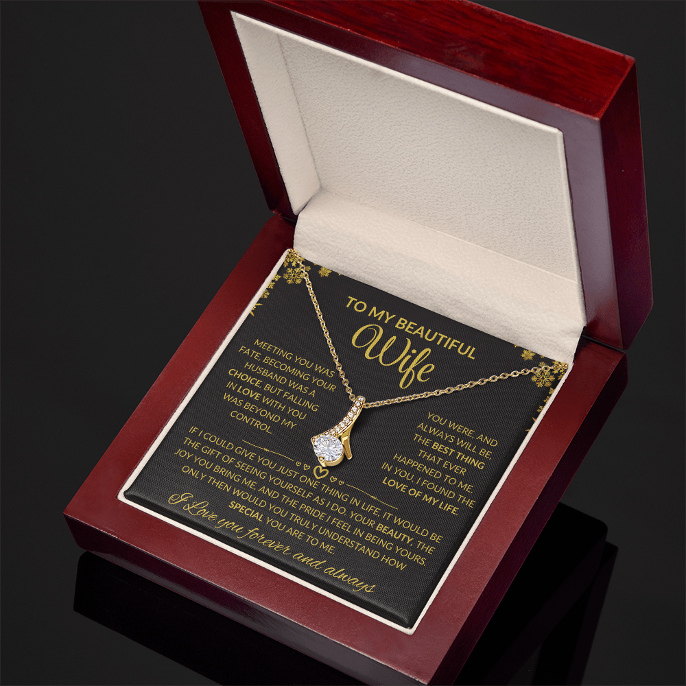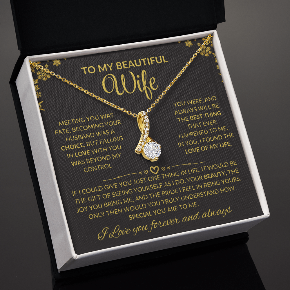 Imagine the look on her face when she opens this breathtaking gift! The Alluring Beauty necklace is more than just jewelry, it's a heartfelt gesture she'll treasure forever. With its graceful ribbon-shaped pendant and timeless sparkle, this piece is perfect for making any occasion unforgettable, whether it's her birthday, anniversary, or simply a moment to say 'I love you.'