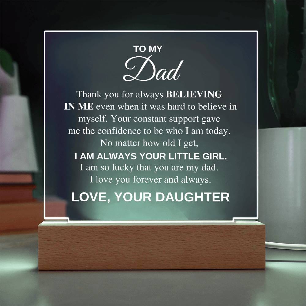 Introducing our Square Acrylic Plaque! This design is printed on premium crystal-clear acrylic and effortlessly becomes the focal point of any room. Its modern design is complemented by a sleek wooden base, adding a touch of elegance to the display. Our LED wooden base makes a striking presentation and is a perfect gift for your dad, partner, family, or friends on special occasions such as anniversaries, birthdays, or any event where you want to express your love and appreciation in a memorable way. Show your loved ones how much they mean to you by purchasing today!