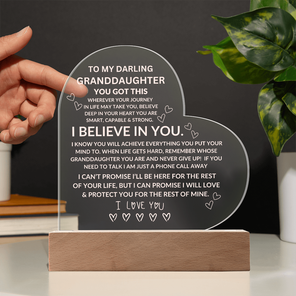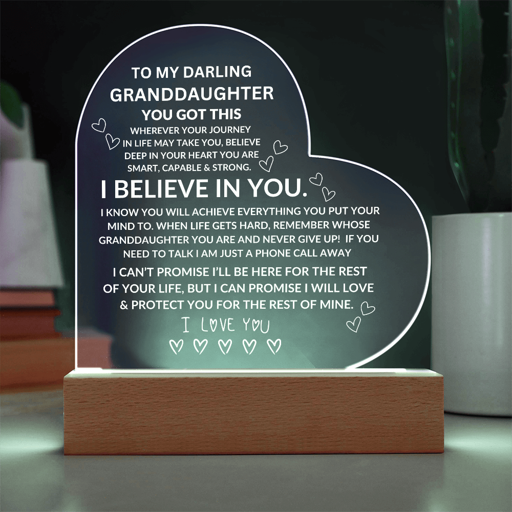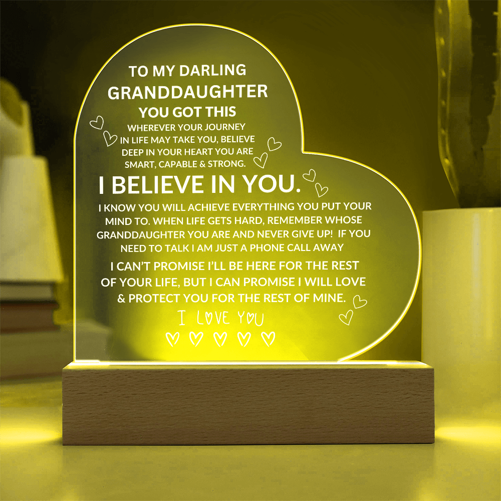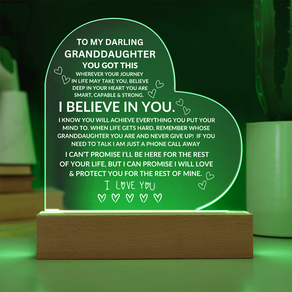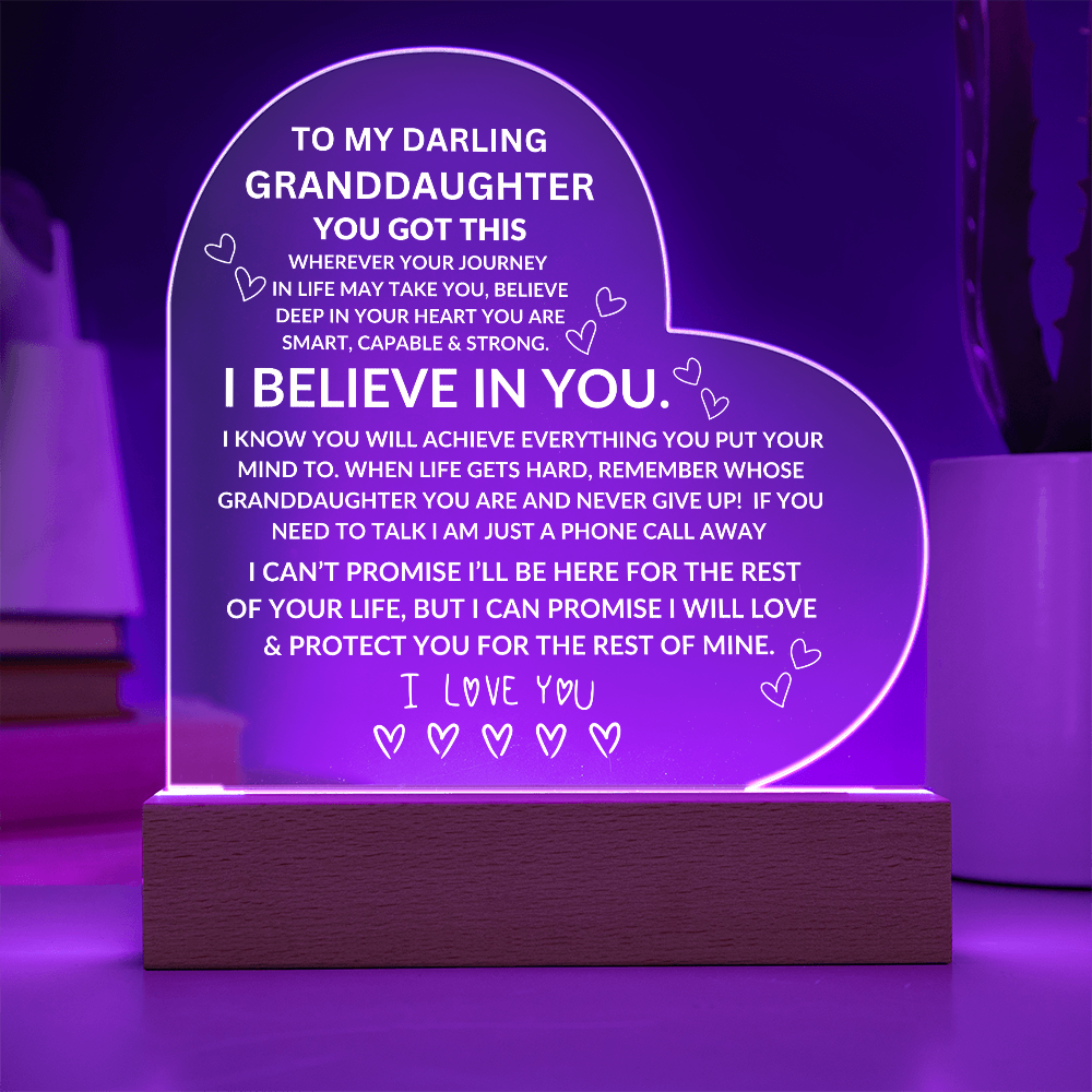 Your plaque will be crafted from premium acrylic with a professionally printed design for a polished look. It comes with a stylish wooden LED base, and you can choose between a USB plug-in option OR a cordless battery-operated option (requires 2 AAA batteries, not included). Both LED bases feature 7 vibrant colors, allowing the user to customize the lighting with various color changes and dynamic cycles.