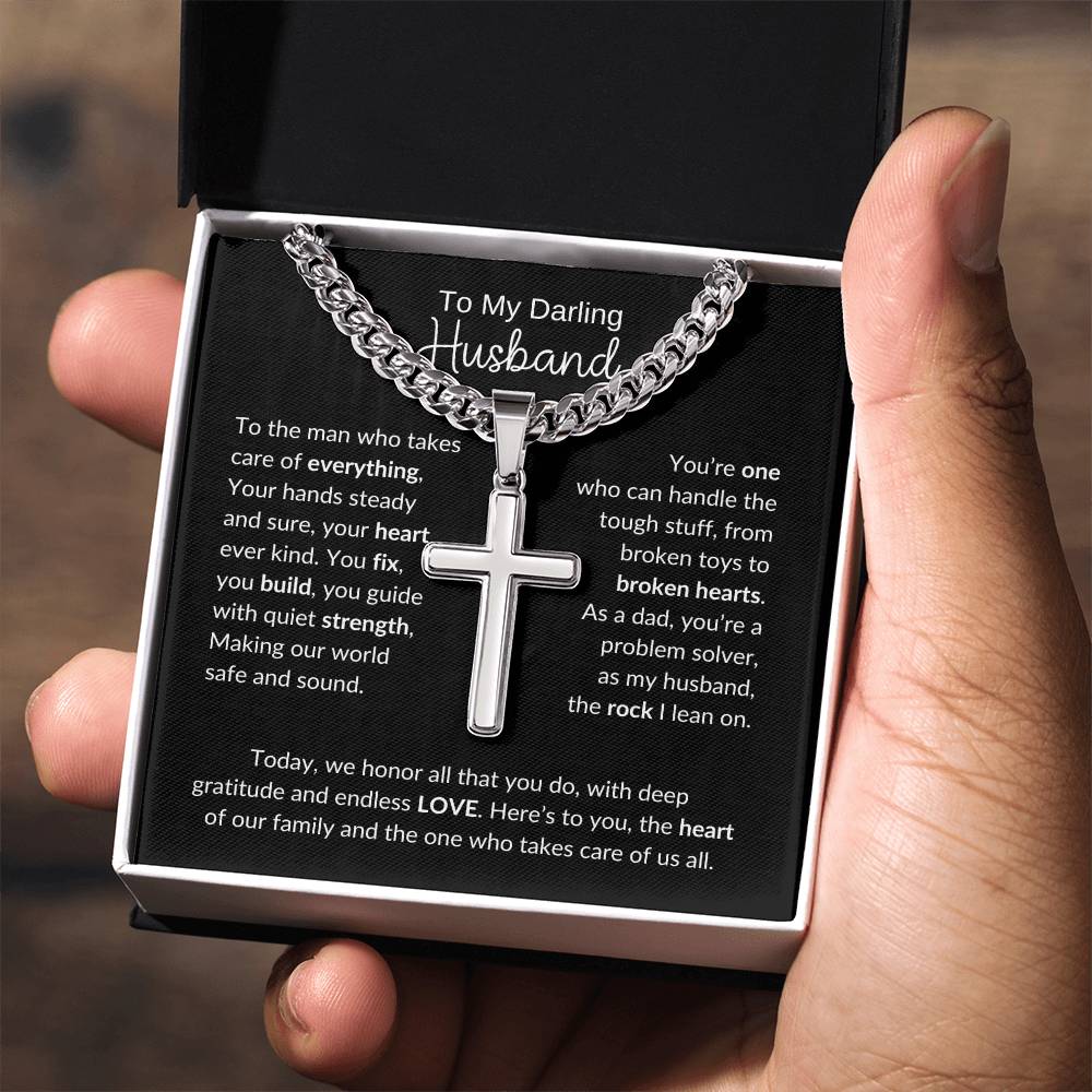 Share this gift of love with your husband. This Cuban Chain with Artisan Cross Necklace is perfect or special occasions, anniversaries, birthdays, Father's Day and perfect for everyday wear. This makes a wonderful gift for the man you love and the father of your children.